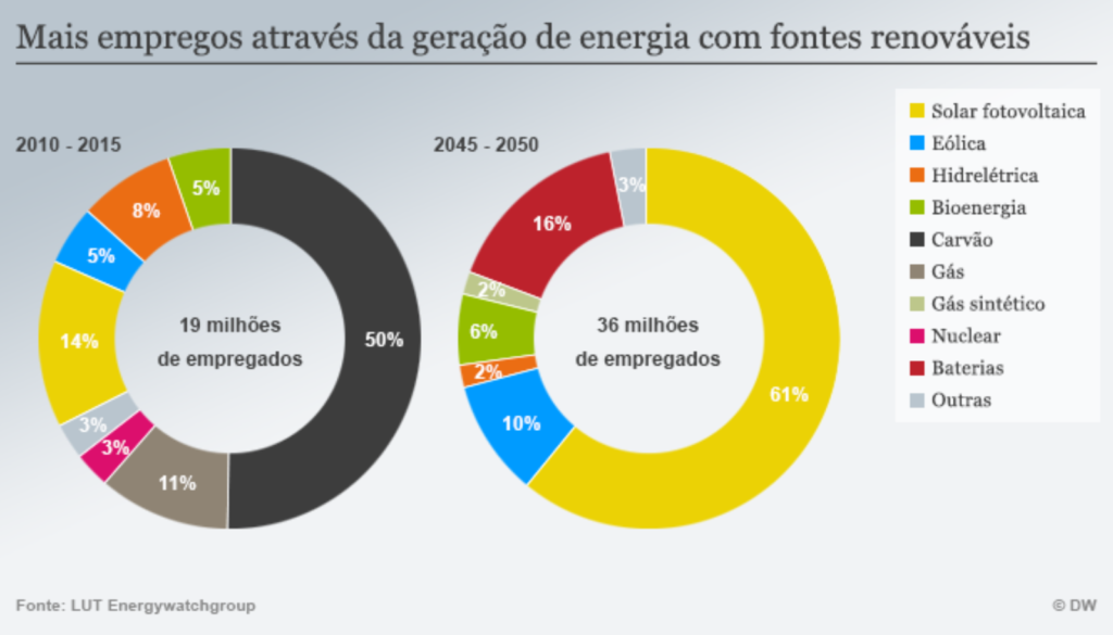 Os empregos na indústria carbonífera já sofreram perdas no mundo todo. Por outro lado, estimativas apontam que dobrará a quantidade de postos de trabalho no setor de geração de energia renovável, principalmente na área da energia solar, tecnologia de baterias e energia eólica.